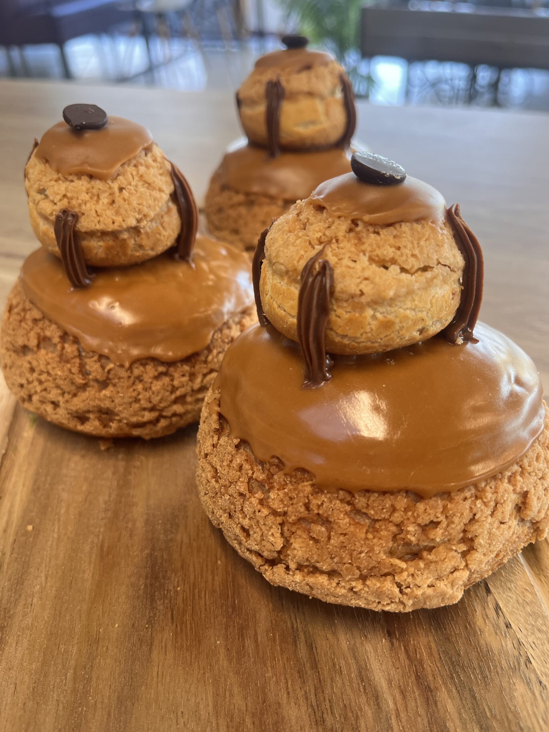 Deux choux superposés, crème café, glaçage café.